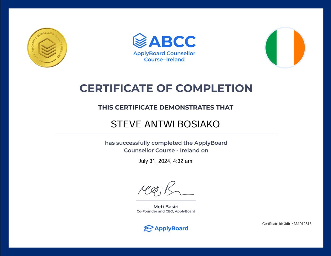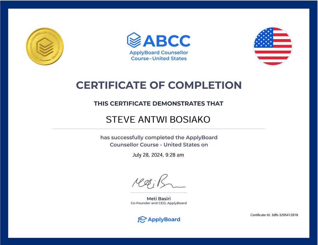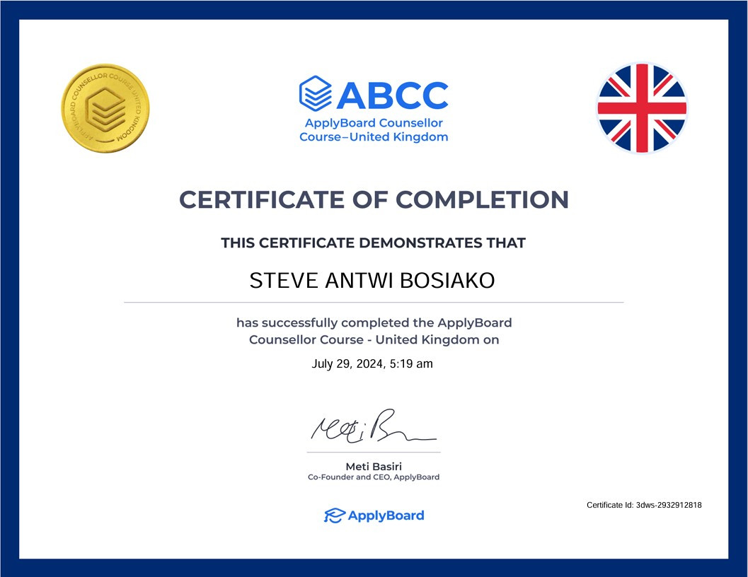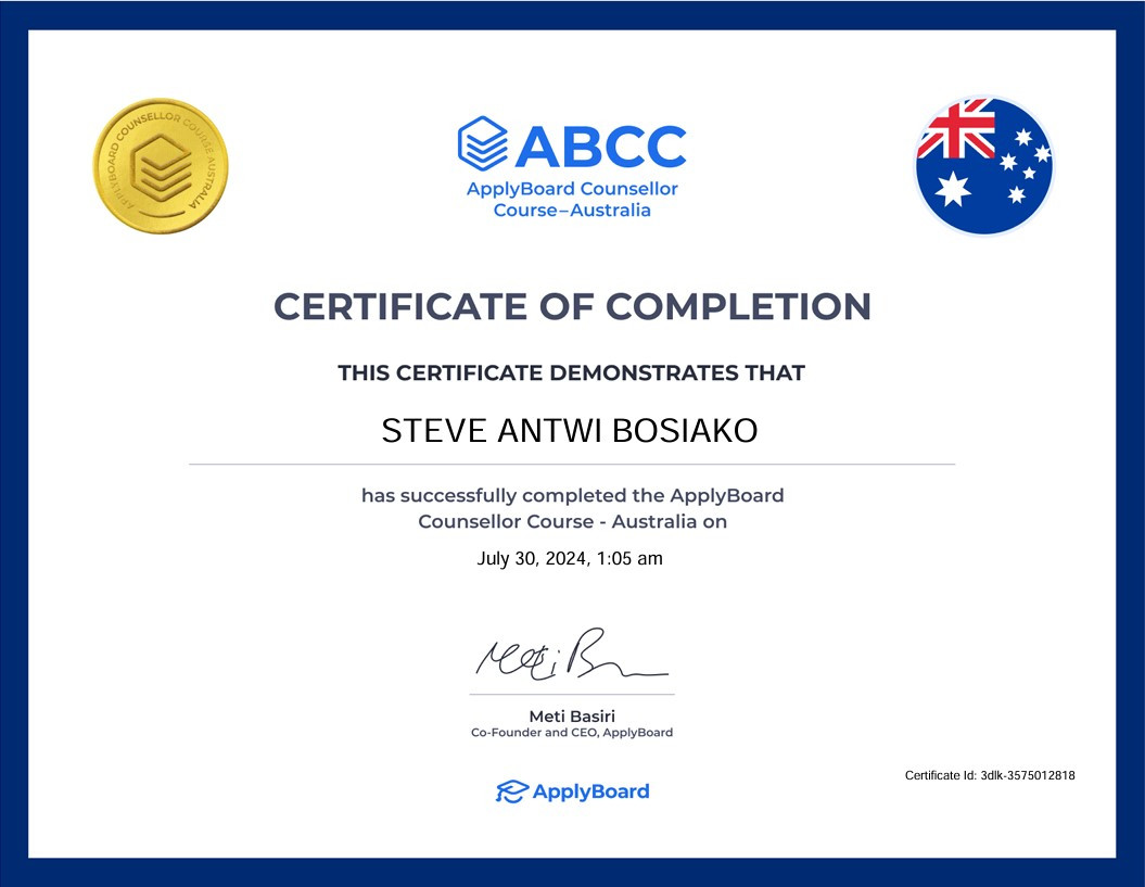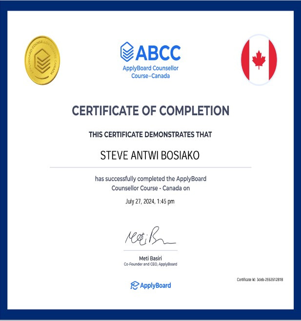 STANBO proudly serves as the Official Ghana Representative of the ApplyBoard Counselor Course (ABCC - Canada). This strategic designation places STANBO at the epicenter of Ghana's engagement with internationally recognized counselor certification and guidance excellence. This representative role reinforces and demonstrates STANBO's commitment to elevating educational consultancy services across borders, advocating for best practices in Study Abroad consultancy services and couselor training, and ensuring that Ghana's voice is heard in future international forums of global counseling educational consultancy. With accreditation by ABCC-Canada, registration and verification by Registrar of companies - Ghana, and recognitions from ABCC Regional Offices (USA, Canada, United Kingdom (UK), Ireland and Australia), STANBO's credibility is multi-layered, dynamic, and future-facing legitimacy and strategic diplomacy in global educational consultancy transformation, with such clarity backed by authority and trust. This ambassadorial status reflects STANBO's commitment to provide inform insights, local coordination, and Study Abroad guidance for aspiring professionals and partner institutions (universities, colleges), across multiple territories.