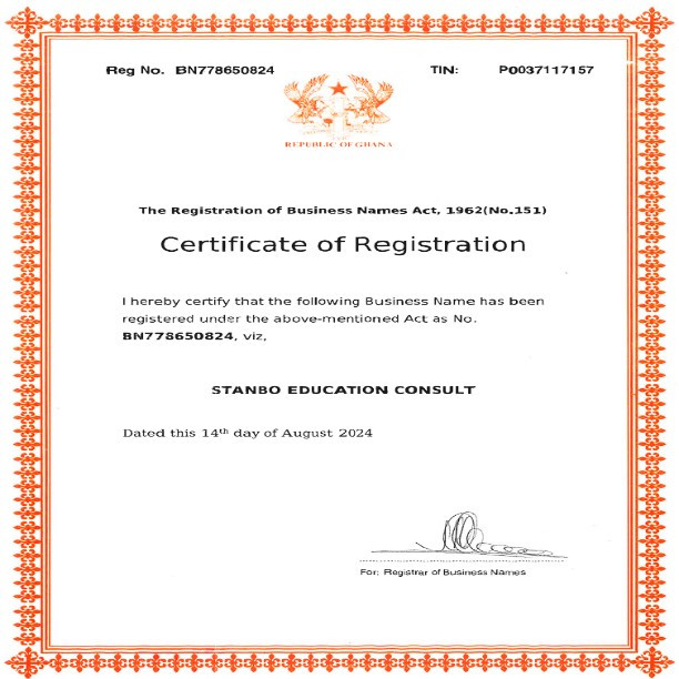 STANBO EDUCATION CONSULT (SEC) is duly registered, verified and recognized by the Registrar of Companies - Ghana.